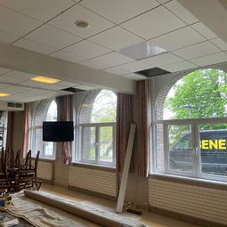 Alles kamers, burelen, vergaderzalen, het restaurant en cafetaria, kortom het hele woonzorgcentrum wordt voorzien van 146 nieuwe windvaste opbouw screens. De moeilijk boogramen krijgen doeken met Somfy motoren die boven het raam in de spouwmuur worden ingebouwd. Een heel werk met een mooi resultaat.